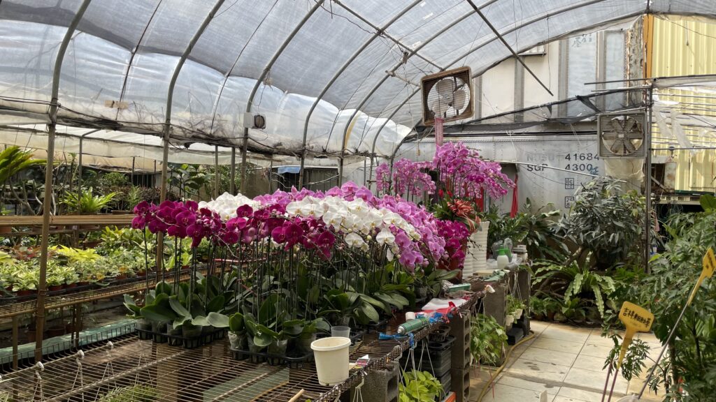 Malgré tout, nous avons décidé d’offrir des fleurs à sa mère pour la remercier de nous accueillir. Avant de nous rendre chez lui, nous passons chez un fleuriste. Mais l’endroit ressemble davantage à un grand jardin qu’à un magasin de fleurs. Nous cherchions un bouquet, mais il n’y en avait pas. Nous avons donc opté pour un pot d’orchidées, qui sont très courantes à Taïwan. Nous avons été surpris par la taille imposante de certains spécimens, présentés dans des pots gigantesques.