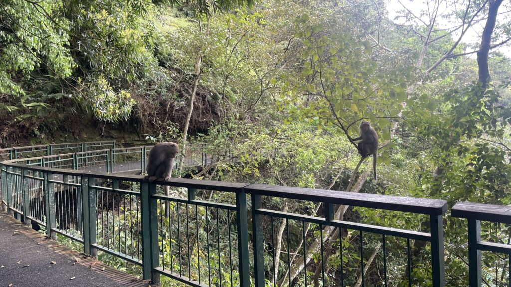 Un peu plus loin, nous tombons sur des singes en liberté qui nous observent depuis les rambardes. Ils ont tout de même l’air un peu agressifs, alors nous ne restons que le temps de prendre quelques photos et de les voir sauter de branche en branche avant de reprendre notre balade à vélo.
