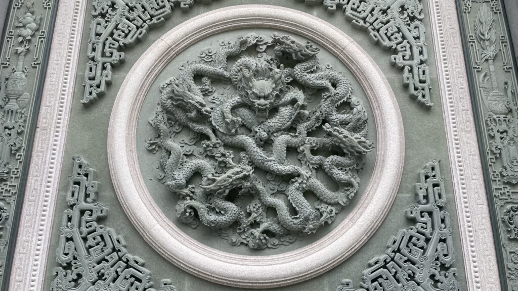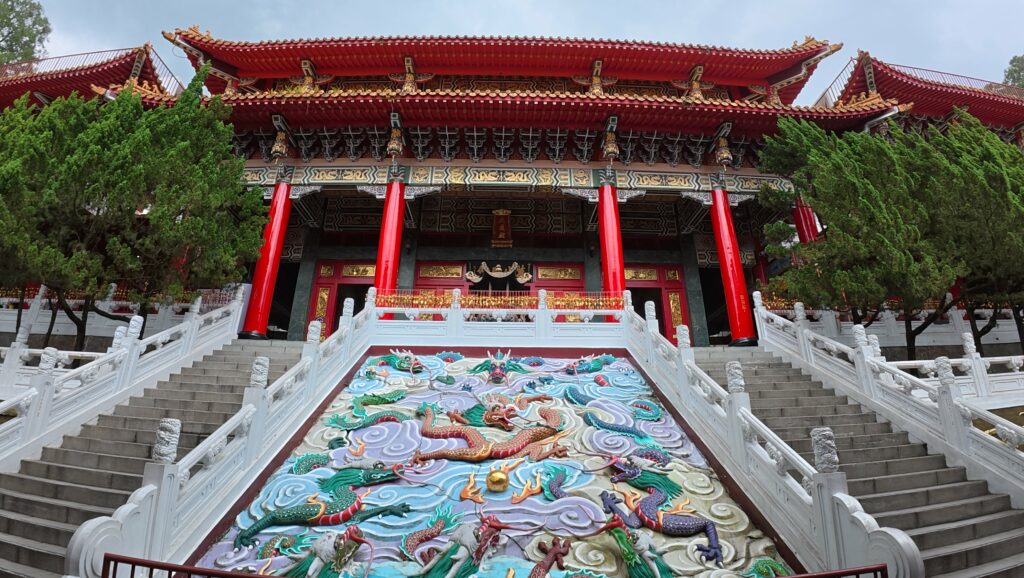 Après plusieurs semaines sans faire de sport, nos cuisses brûlent en montant vers le temple Wenwu. À peine arrivés, nous nous sentons tout petits. Ce temple, face au lac et gardé par deux statues géantes de lions, est immense. Nous prenons le temps de nous promener à l’intérieur et autour du temple pour profiter des points de vue et en apprendre davantage sur leur religion. Nous en profitons aussi pour discuter avec nos amis de géopolitique, notamment de la menace chinoise. Ils nous expliquent qu’en cas d’invasion, ce ne serait pas le service militaire obligatoire de trois mois qui leur permettrait de résister, mais plutôt l’intervention d’une coalition internationale.