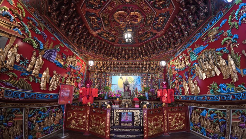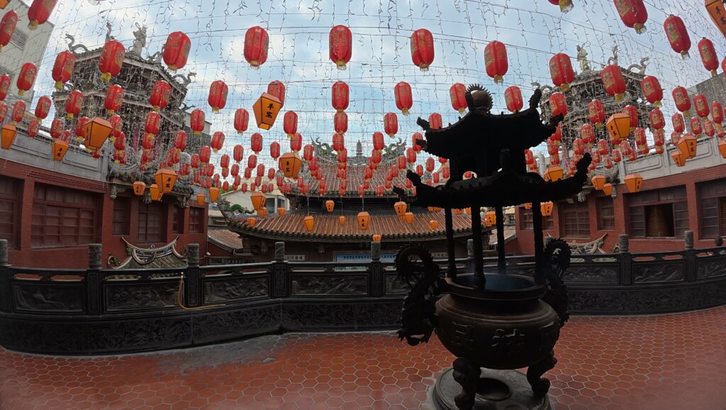 Nous poursuivons notre visite par un temple chinois historique dédié à Mazu, la déesse de la mer, l’une des divinités les plus vénérées à Taïwan. Son architecture colorée nous plaît, et des lanternes forment un plafond lumineux. Comme c’est la première fois que nous visitons un temple avec notre ami, nous en profitons pour lui poser plein de questions et en apprendre davantage sur le taoïsme, la religion majoritaire dans le pays.