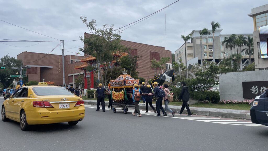 Nous rentrons pour nous reposer et dîner avec la famille de Hsin, avant de ressortir en soirée pour assister au festival dédié à Mazu, la divinité la plus importante à Taïwan. C’est son anniversaire, ce qui en fait le plus grand événements religieux de Taïwan. La légende de Mazu s’est développée au fil des siècles, d’abord en tant que protecteur des marins, aujourd’hui elle est vénérée par des millions de personnes pour sa bienveillance et sa protection dans tous les aspects de la vie. Chaque printemps, des communautés entières se mobilisent pour honorer Mazu avec des rituels et des pèlerinages spectaculaires, priant pour la paix et la chance. La procession dure plusieurs jours et nuits et couvre des centaines de kilomètres, traversant notamment le comté de Changhua où nous nous trouvons.