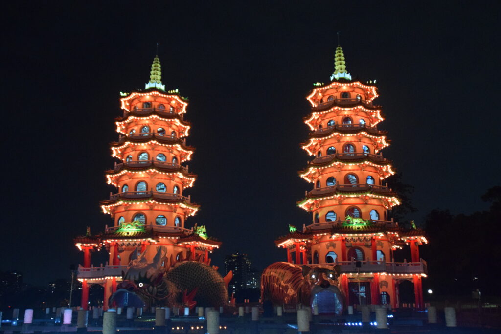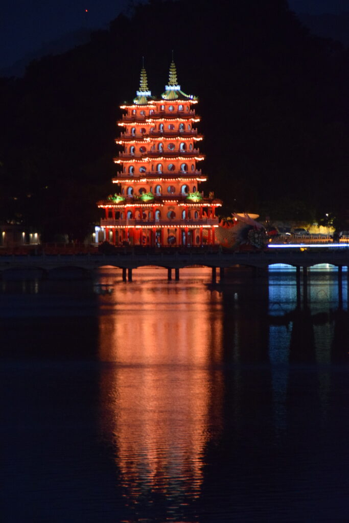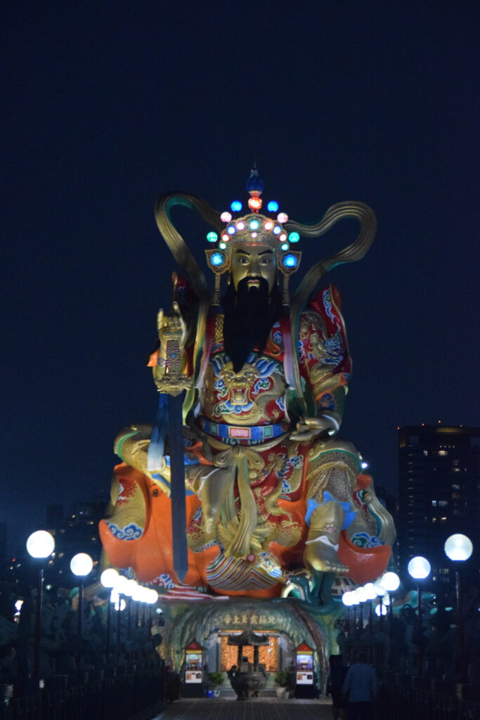 En début de soirée, nous nous rendons vers l’étang du Lotus, où plusieurs temples sont à visiter. Au bord de l’eau, nous découvrons le temple Zuoying Yuandi, une immense statue représentant une divinité. À l’intérieur, nous retrouvons les traditionnels morceaux de bois rouges servant à interroger les dieux, mais cette fois en format XXL.