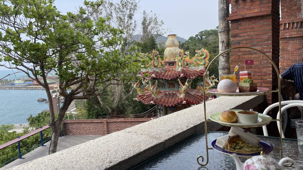 Pour rejoindre l’ancien consulat britannique, nos téléphones nous indiquent de prendre un bus, mais nous ne trouvons pas l’arrêt. Comme le prochain n’est pas prévu tout de suite, nous décidons de marcher jusqu’à l’arrêt suivant. En arrivant, nous découvrons une queue d’une vingtaine de personnes, certaines avec des valises. Un bus minuscule s’approche, et nous espérons qu’il ne s’agit pas du nôtre… mais il s’arrête à notre hauteur, et tout le monde monte, nous y compris. Après un trajet mouvementé de quelques minutes, nous descendons et montons quelques marches pour atteindre le bâtiment en briques. De là, nous avons une belle vue sur l’océan. La visite est payante, mais elle donne droit à une réduction au café. Nous nous laissons tenter et décidons de prendre un « tea time ».