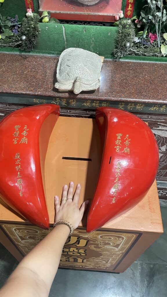Nous avons l’impression qu’il s’y déroule une cérémonie dont nous ne comprenons pas trop la logique. Nous entendons juste 3 personnes répéter à tour de rôle des numéros qui on été piochées au hasard et une quatrième laissant tomber au sol des morceaux de bois rouges (la plupart du temps) en forme de croissant, avec un côté plat et un côté incurvé. Hsin nous a déjà expliqué ce type de prière. Cette technique, permet de poser une question fermé au dieu du temple et sa réponse qui est oui ou non, dépendra des faces sur lesquelles les morceaux sont tombés. Il y a également des offrandes que nous avions jusqu’ici jamais vu, un poulet entier ou encore un poisson, que nous voyons juste avant de partir.