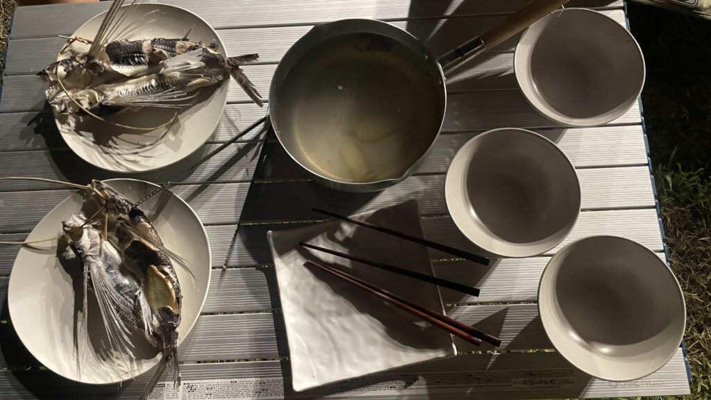 La spécialité culinaire de l’île est le poisson volant. Selon les traditions de la tribu locale, ce poisson est sacré et ne peut être mangé que bouilli. Bien que l’ami de Hsin ne soit pas aborigène, il connaît bien leurs coutumes et nous sert du poisson cuit dans un bouillon au gingembre. Une autre tradition veut que l’on fasse une prière ou un vœu la première fois de l’année que l’on goûte ce plat. Chacun notre tour, nous exprimons nos souhaits avant de déguster ce mets, qui est plutôt bon.