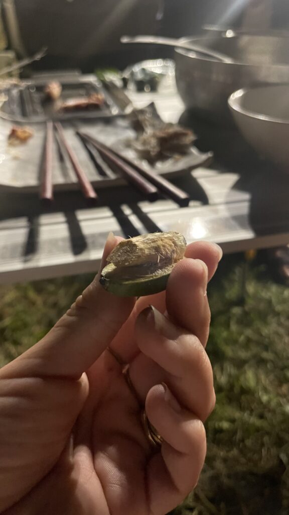 Nous passons la soirée autour du feu à discuter, grâce à Hsin, car son ami est moins à l’aise que lui en anglais. Nous abordons un sujet qui nous intrigue : la substance que certains Taïwanais mâchent parfois toute la journée. En mandarin, cela s’appelle « Bin Lang ». Il nous explique qu’il en consomme régulièrement de manière sociale et nous propose d’essayer. Sans savoir à quoi nous attendre, nous acceptons. Il appelle un ami, un indigène, qui arrive en quelques minutes. Hsin nous apprend quelques mots de politesse que nous prononçons très mal, mais qui semblent faire plaisir à cet homme. Il s’installe près de nous et sort de sa sacoche des sachets contenant tout le nécessaire pour préparer le mélange. Celui-ci se mâche comme du tabac et contient une noix d’arec, de la chaux (remplacée ici par de la poudre de coquillage) et une feuille de bétel. Avant de nous le donner, ils nous avertissent de ne surtout pas avaler notre salive, de cracher régulièrement et de le placer entre la mâchoire et la joue. Ils ajoutent que, selon le dosage, nous pourrions ressentir des effets secondaires. L’expérience devient de moins en moins rassurante.
