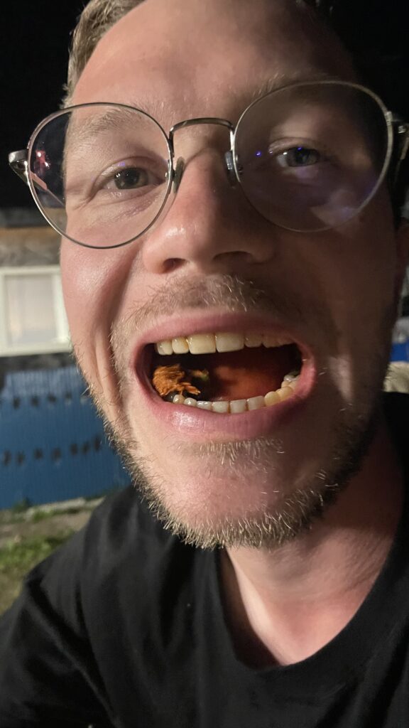 Nous passons la soirée au bar des propriétaires de l’auberge qui nous héberge. Nous discutons et rions encore une fois de nos différences culturelles. Pour un « midnight snack », nous sortons goûter des beignets fourrés.