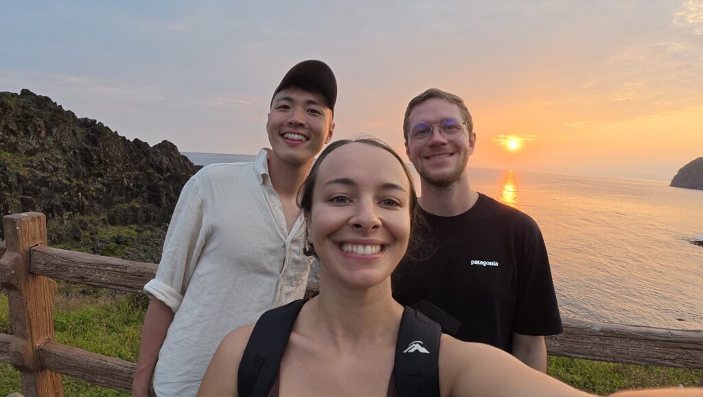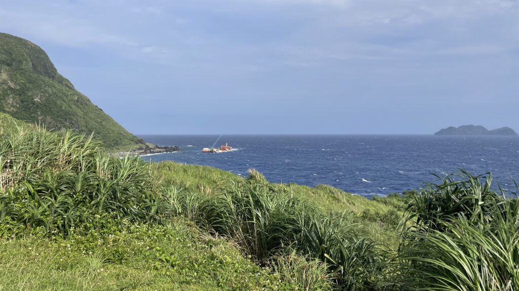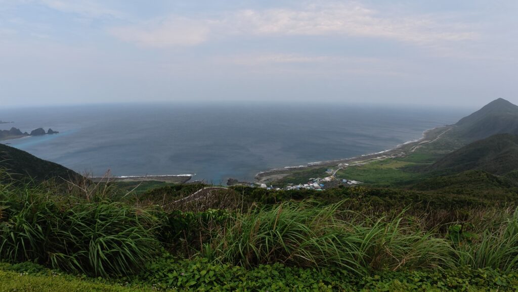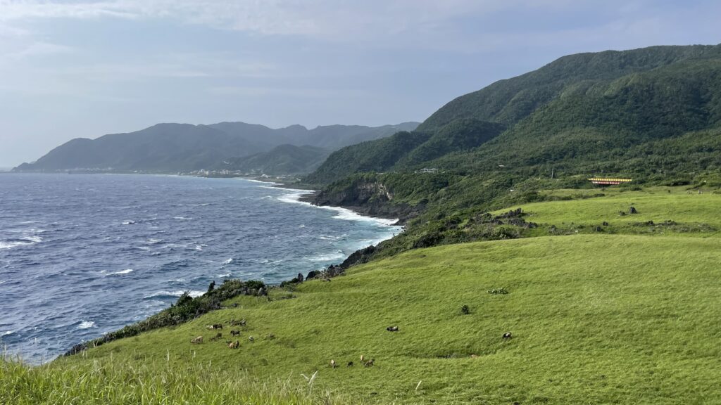 Pour le déjeuner, Hsin nous trouve un restaurant avec une terrasse offrant une vue sur l’océan. Puis, l’après-midi, nous explorons le sud de l’île en empruntant la seule route qui la traverse, en passant par les montagnes. Nous nous arrêtons près d’un ancien bâtiment militaire situé en hauteur, ce qui nous offre un joli point de vue. Le reste de la journée est plutôt calme. Nous nous arrêtons au bord de la route quand nous en avons envie, pour profiter des paysages qui, parfois, nous rappellent la Nouvelle-Zélande, avec leurs terrains verts et leurs moutons en train de paître.