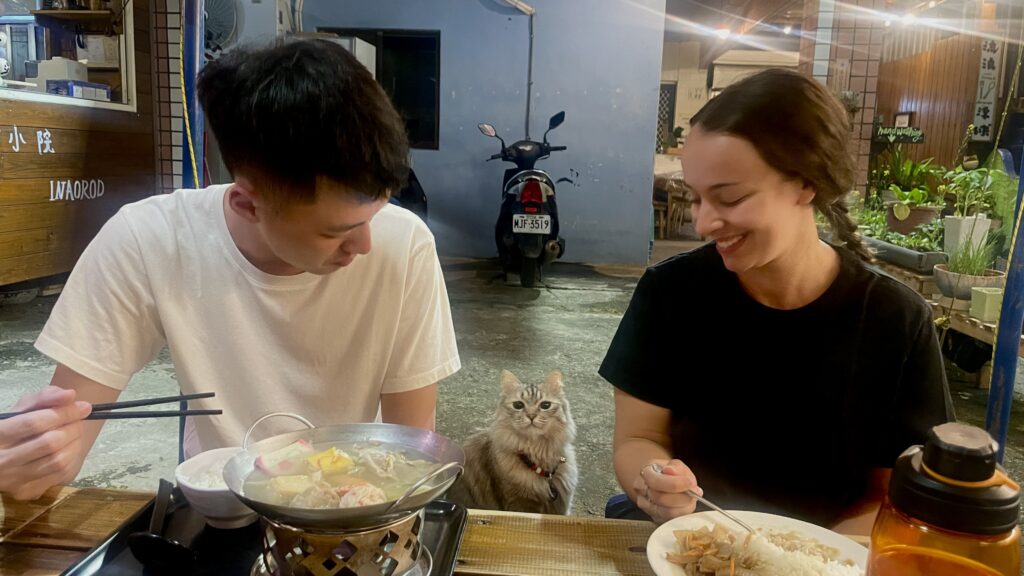 Le temps de déposer nos affaires et de discuter avec ses amis, il est déjà le milieu de l’après-midi, et nous n’avons toujours pas mangé. La ville est petite, et les options de restauration sont limitées. Nous optons donc pour des pâtes dans un café-cinéma. Les portions sont un peu légères à notre goût, alors, avant de rentrer, nous passons devant un café à chats. Nous nous arrêtons pour prendre un dessert tout en profitant des occupants des lieux, très câlins.