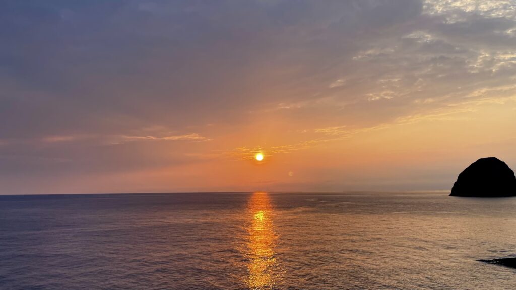 Le soleil devient de plus en plus rasant et les nuages ne semblent pas trop épais, alors nous remontons sur nos scooters en direction d’un point de vue dégagé. Nous n’avions pas encore profité d’un coucher de soleil sur l’île. À notre arrivée, nous ne sommes pas les seuls à vouloir admirer le spectacle : d’autres scooters sont déjà en place. Nous ne sommes pas déçus, les reflets orangés sont splendides, et nous restons contemplatifs.
